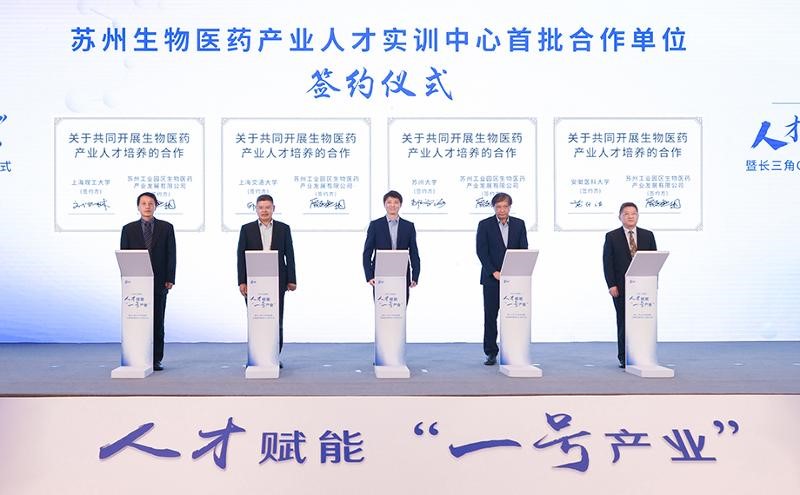 活動(dòng)中,蘇州生物醫(yī)藥產(chǎn)業(yè)人才實(shí)訓(xùn)中心同時(shí)舉行共建簽約。為加快生物醫(yī)藥產(chǎn)業(yè)人才自主培養(yǎng)進(jìn)程,園區(qū)以產(chǎn)才融合為導(dǎo)向,結(jié)合產(chǎn)業(yè)需求,依托長(zhǎng)三角高校、企業(yè)、平臺(tái)集聚優(yōu)勢(shì),建設(shè)蘇州生物醫(yī)藥產(chǎn)業(yè)人才實(shí)訓(xùn)中心。該中心由園區(qū)生物產(chǎn)業(yè)發(fā)展公司牽頭發(fā)起,上海理工大學(xué)、蘇州大學(xué)、安徽醫(yī)科大學(xué)等單位簽約共建,集研究、培訓(xùn)、實(shí)踐于一體,聚焦生物醫(yī)藥研發(fā)、臨床、生產(chǎn)、應(yīng)用、管理五大方向,通過(guò)在校學(xué)生實(shí)訓(xùn)、在職人員培訓(xùn)和職業(yè)標(biāo)準(zhǔn)認(rèn)證等方式,著重培養(yǎng)研發(fā)、臨床、生產(chǎn)三類生物醫(yī)藥急需人才,一期每年可為行業(yè)培養(yǎng)1000名高層次人才和1000名高潛力人才。
