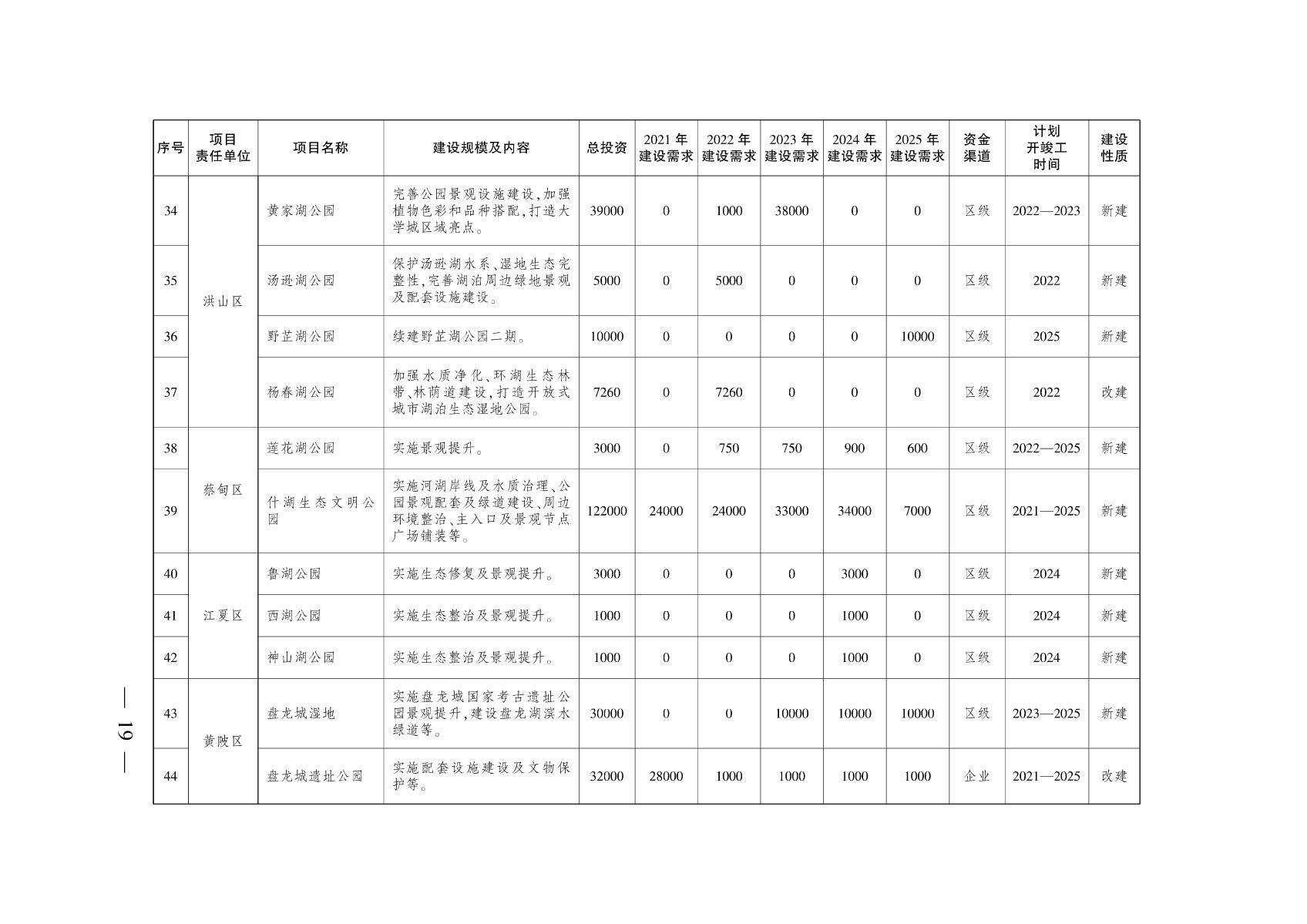 2.建設(shè)濕地類(lèi)型公園。結(jié)合湖泊治理,打造景觀之湖,使湖泊濕地成為集聚休閑、游憩、文化等多種功能的高品質(zhì)公共空間。中心城區(qū)的湖泊濕地以景觀提升為主,改建24個(gè)湖泊公園,新建16個(gè)湖泊公園。新城區(qū)、開(kāi)發(fā)區(qū)的湖泊濕地結(jié)合郊野公園進(jìn)行建設(shè),新建、續(xù)建40個(gè)郊野湖泊公園。(牽頭單位:市園林林業(yè)局;責(zé)任單位:市水務(wù)局,各區(qū)人民政府)