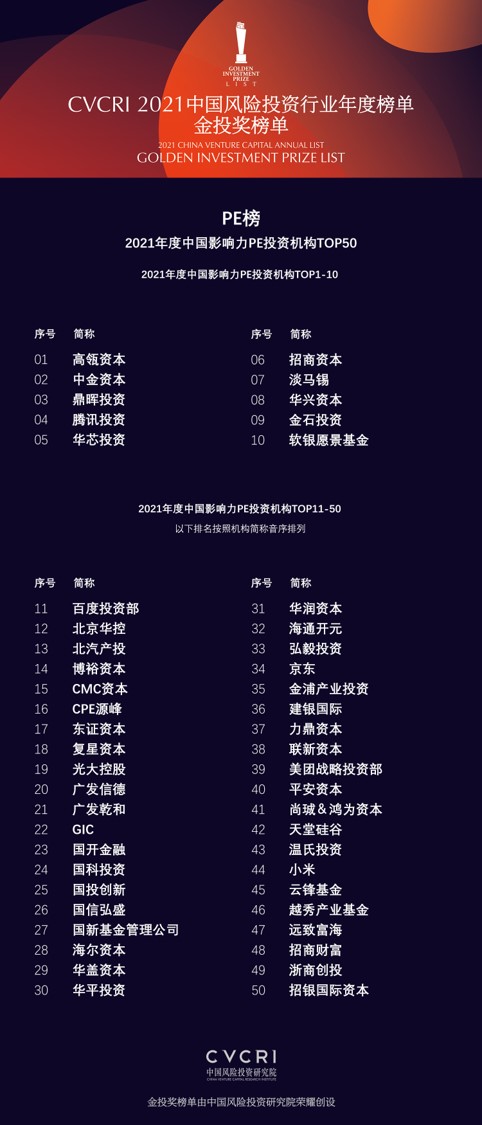 2021年度中國影響力PE投資機構(gòu)TOP50,高瓴資本榮登榜首