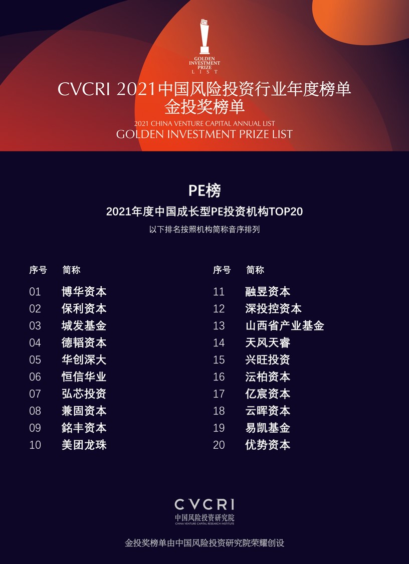 2021年度中國成長型PE投資機構(gòu)TOP20,博華資本榮登榜首
