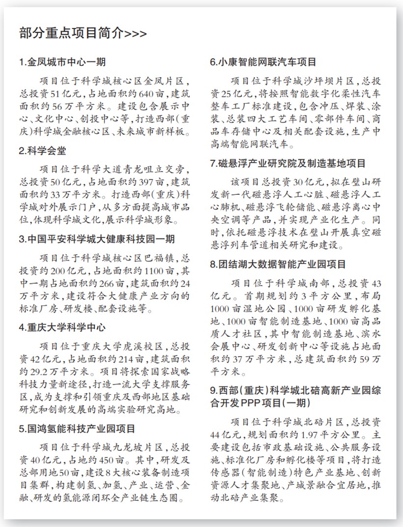 科學(xué)城九龍坡片區(qū)項(xiàng)目共7個(gè)、總投資90億元,具體包括潤(rùn)澤(西南)數(shù)據(jù)經(jīng)濟(jì)產(chǎn)業(yè)園、西彭園區(qū)智能高科技產(chǎn)業(yè)基地標(biāo)準(zhǔn)廠房項(xiàng)目等。科學(xué)城沙坪壩片區(qū)項(xiàng)目共8個(gè)、總投資90億元,具體包括美宜佳(重慶)產(chǎn)業(yè)園、人工智能應(yīng)用研發(fā)中心暨總部基地等??茖W(xué)城璧山片區(qū)項(xiàng)目共8個(gè)、總投資86億元,具體包括磁懸浮產(chǎn)業(yè)研究院及制造基地、華道生物西部細(xì)胞免疫治療研發(fā)和生產(chǎn)轉(zhuǎn)化中心基地等??茖W(xué)城江津片區(qū)項(xiàng)目共8個(gè)、總投資69億元,具體包括團(tuán)結(jié)湖大數(shù)據(jù)智能產(chǎn)業(yè)園、電梯物聯(lián)網(wǎng)產(chǎn)業(yè)園等重點(diǎn)項(xiàng)目??茖W(xué)城北碚片區(qū)項(xiàng)目共4個(gè)、總投資68億元,具體包括西部(重慶)科學(xué)城北碚高新產(chǎn)業(yè)園綜合開發(fā)PPP項(xiàng)目(一期)、縱目科技無線充電子公司西南總部等。