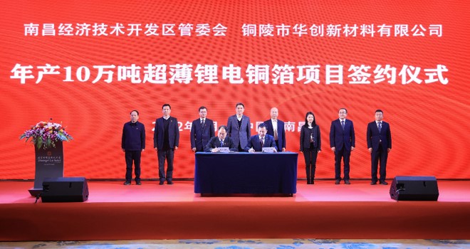 1月20日,南昌經(jīng)開區(qū)與銅陵市華創(chuàng)新材料有限公司年產(chǎn)10萬噸超薄鋰電銅箔生產(chǎn)項(xiàng)目簽約儀式舉行。該項(xiàng)目總投資約100億元,整體項(xiàng)目達(dá)產(chǎn)后可實(shí)現(xiàn)年均銷售額約100億元,年稅收4億元,并帶動(dòng)就業(yè)2500余人。