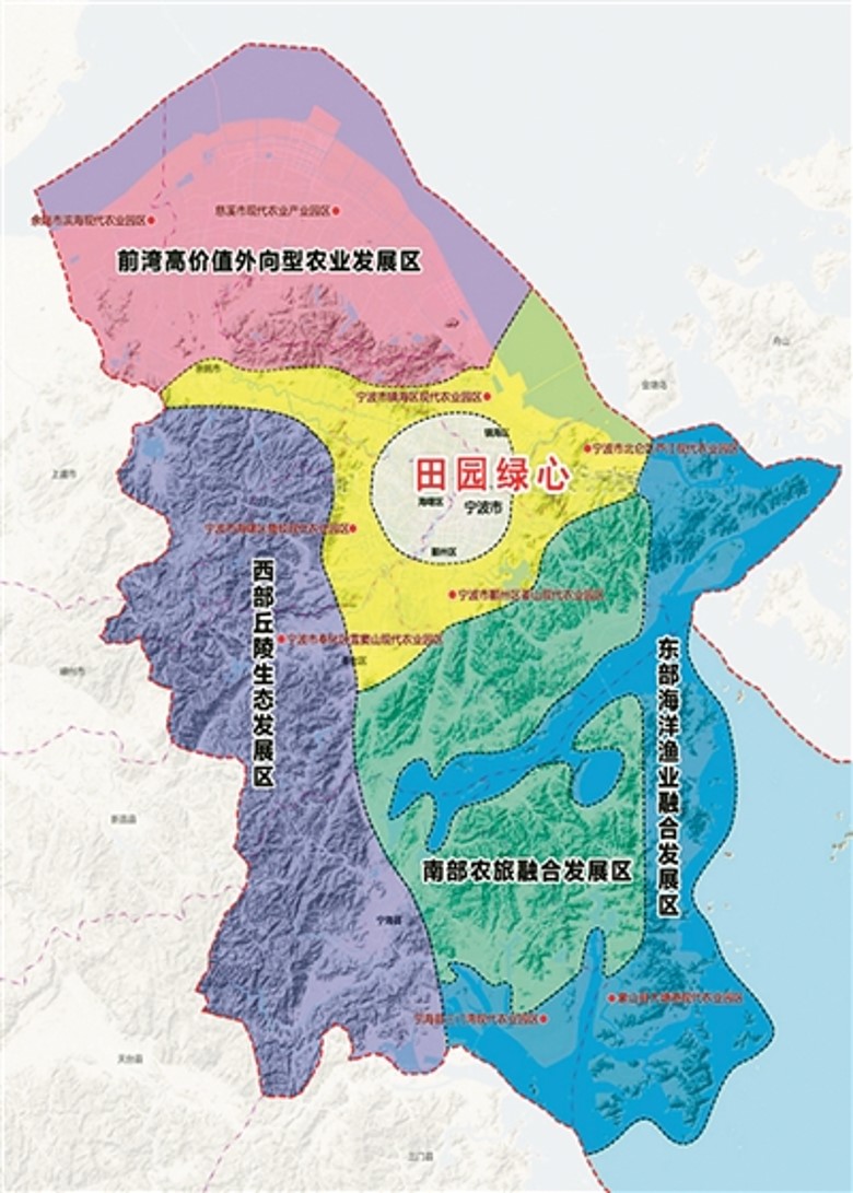 “四區(qū)”分別是:前灣高價值外向型農業(yè)發(fā)展區(qū)、西部丘陵生態(tài)發(fā)展區(qū)、南部農旅融合發(fā)展區(qū)和東部海洋漁業(yè)融合發(fā)展區(qū);“十帶”分別是:城郊產村融合經濟帶、余姚江兩岸農耕文明帶、奉化江兩岸糧經帶、前灣現代農業(yè)示范帶、象山港農漁旅融合經濟帶、寧象高效農業(yè)示范帶、四明山休閑觀光農業(yè)帶、西南林特產業(yè)示范帶、山海生態(tài)產業(yè)示范帶和海洋漁業(yè)發(fā)展帶。
