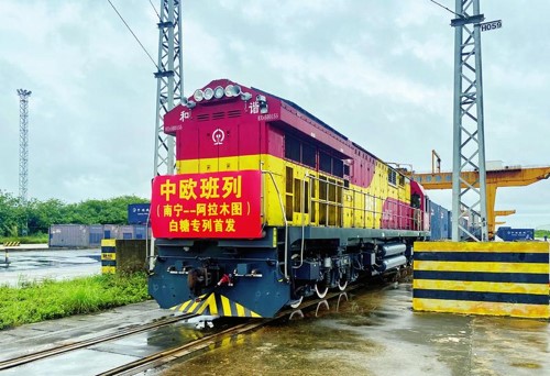 5月15日,搭載2600噸白糖的中歐班列從南寧國(guó)際鐵路港駛出,途經(jīng)阿拉山口出境前往哈薩克斯坦阿拉木圖。這是廣西發(fā)出的首趟整列食品出口中歐班列,標(biāo)志著跨境運(yùn)輸整車出口貨物再添新品類。