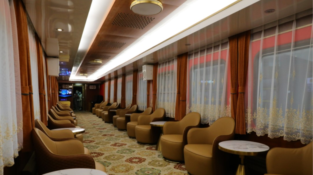 這趟列車上配有專業(yè)烹調(diào)主廚,全程提供餐飲服務(wù)。餐車可根據(jù)行程提供早餐、中餐及晚餐。酒吧車除提供酒水服務(wù)外,還配有高清電視、鋼琴、影音設(shè)備,游客在車內(nèi)可以觀看電影、K歌、舉行茶話會(huì)等。