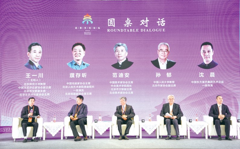 文藝精品創(chuàng)作與傳播分論壇以“創(chuàng)作文藝精品引領(lǐng)美好時代”為主題,文化名人群賢畢至,共敘精品創(chuàng)作傳播之路?!叭嗣袼囆g(shù)家”、著名作家王蒙及著名導(dǎo)演張藝謀通過視頻進(jìn)行了主題發(fā)言。中國戲劇家協(xié)會主席濮存昕,中央美術(shù)學(xué)院院長、中國美術(shù)家協(xié)會主席范迪安,北京作家協(xié)會副主席孫郁,中國東方演藝集團(tuán)藝術(shù)總監(jiān)沈晨,在圓桌對話上共同探討了“如何推動產(chǎn)生文藝精品”。此外,北京電影家協(xié)會主席、《長津湖》總監(jiān)制黃建新,博納影業(yè)集團(tuán)董事長、中國電影家協(xié)會副主席于冬,《覺醒年代》導(dǎo)演張永新及主演于和偉等,圍繞“新時代的影視精品創(chuàng)作”,探討“思想精深”“藝術(shù)精湛”與“制作精良”,提出了各自的真知灼見。