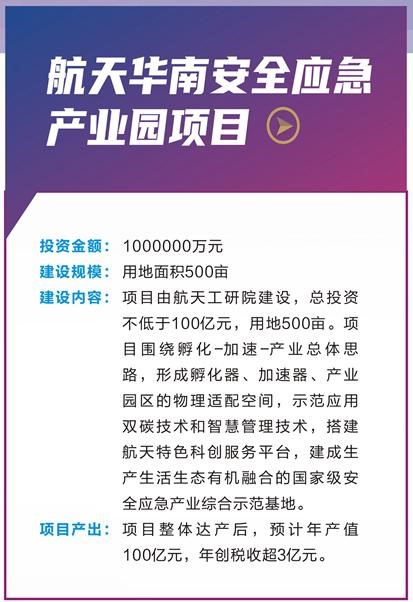 參與簽約的航天華南安全應(yīng)急產(chǎn)業(yè)園項目總投資不低于100億元,將圍繞“孵化—加速—產(chǎn)業(yè)”總體思路,形成孵化器、加速器、產(chǎn)業(yè)園區(qū),搭建航天特色科創(chuàng)服務(wù)平臺,建成生產(chǎn)生活生態(tài)有機融合的國家級安全應(yīng)急產(chǎn)業(yè)綜合示范基地;迪馬科技是國內(nèi)應(yīng)急特種車輛和應(yīng)急機器人的龍頭生產(chǎn)企業(yè),新項目將覆蓋應(yīng)急裝備、應(yīng)急通信、應(yīng)急新材料等應(yīng)急裝備產(chǎn)業(yè)。