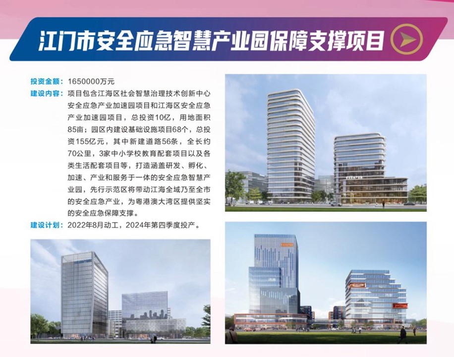 江門市安全應(yīng)急智慧產(chǎn)業(yè)園保障支撐項目總投資165億元,其中包含新建道路56條,3家中小學(xué)校教育配套項目以及各類生活配套項目等,打造涵蓋研發(fā)、孵化、加速、產(chǎn)業(yè)和服務(wù)于一體的安全應(yīng)急智慧產(chǎn)業(yè)園,先行示范帶動安全應(yīng)急產(chǎn)業(yè)發(fā)展。