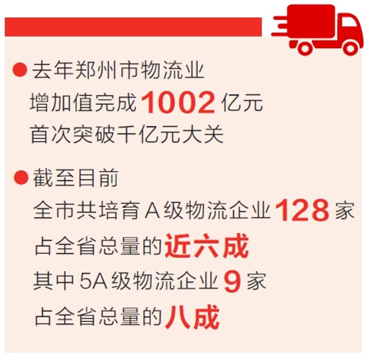 據(jù)統(tǒng)計(jì),去年鄭州市物流業(yè)增加值完成1002億元,首次突破千億元大關(guān)。截至目前,全市共培育A級(jí)物流企業(yè)128家,占全省總量的近六成;其中5A級(jí)物流企業(yè)9家,占全省總量的八成。