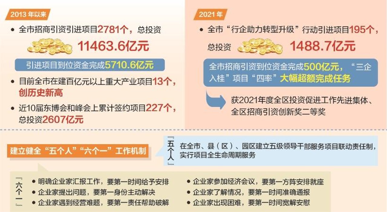 2021年,全市“行企助力轉(zhuǎn)型升級”行動引進(jìn)項(xiàng)目195個,總投資1488.7億元。其中,駐點(diǎn)招商簽約項(xiàng)目總投資726億元,儲備準(zhǔn)簽約項(xiàng)目總投資962億元,兩項(xiàng)指標(biāo)均排全區(qū)第一。全市招商引資到位資金完成500億元、“三企入桂”項(xiàng)目“四率”大幅超額完成任務(wù),獲2021年度全區(qū)投資促進(jìn)工作先進(jìn)集體、全區(qū)招商引資創(chuàng)新獎二等獎。