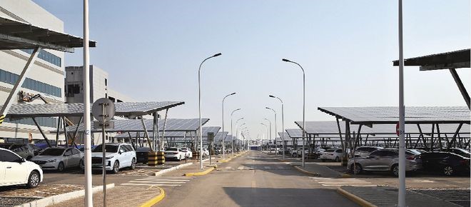 在現(xiàn)場看到,廠區(qū)停車場區(qū)域、廠房及辦公樓的頂部幾乎全部被光伏板覆蓋,總安裝量達(dá)1.192萬塊,鋪設(shè)面積約2.7萬平方米,光伏電站總占地面積超過10萬平方米,產(chǎn)生的電能一部分提供給工廠的生產(chǎn)與照明,而另一部分則通過在廠區(qū)停車場設(shè)立的充電樁,直接為員工的新能源汽車充電。