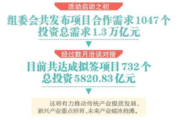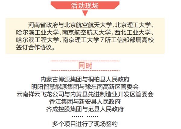 本屆活動(dòng)由工業(yè)和信息化部、中國(guó)工程院、河南省人民政府共同主辦。簽約儀式上,省政府與7所重點(diǎn)高校簽訂省校戰(zhàn)略合作協(xié)議。732個(gè)項(xiàng)目簽約,總投資額5820.83億元,覆蓋新型材料、高端裝備、現(xiàn)代醫(yī)藥、新一代信息技術(shù)等重點(diǎn)領(lǐng)域。