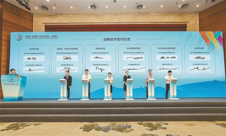 作為產(chǎn)業(yè)對接會的重頭戲,來自柬埔寨、菲律賓、泰國、越南、新加坡等國的企業(yè)、機構代表與深圳等地的30余家新興產(chǎn)業(yè)企業(yè)和機構代表,簽署了20項戰(zhàn)略合作框架協(xié)議,簽約項目涉及商貿(mào)、物流、倉儲、生物科技、機械制造、智能裝備、信息通信等領域,意向合作金額超50億元人民幣。