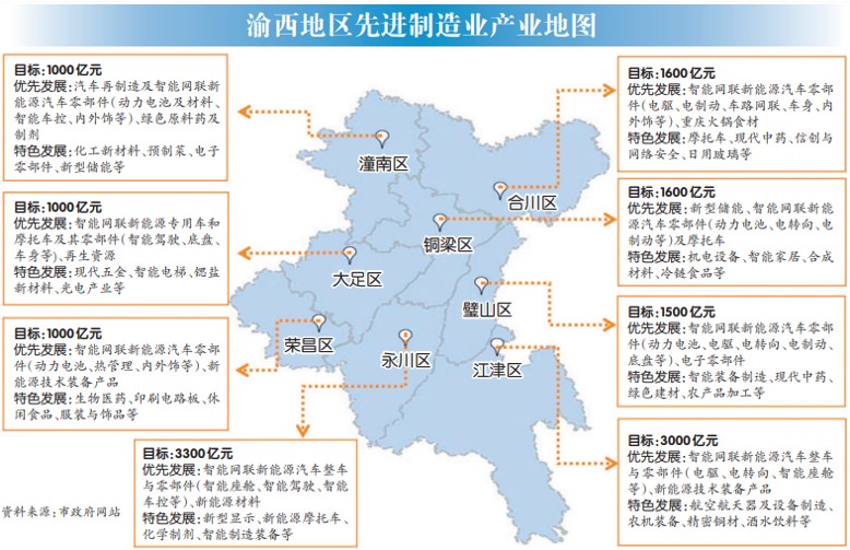 《計(jì)劃》還提出,渝西地區(qū)每個(gè)區(qū)應(yīng)確立不超過(guò)2個(gè)主導(dǎo)產(chǎn)業(yè),同時(shí)確立若干特色產(chǎn)業(yè)進(jìn)行布局。比如,江津可優(yōu)先發(fā)展智能網(wǎng)聯(lián)新能源汽車整車與零部件、新能源技術(shù)裝備產(chǎn)品,特色發(fā)展航空航天器及設(shè)備制造、農(nóng)機(jī)裝備等;合川可優(yōu)先發(fā)展智能網(wǎng)聯(lián)新能源汽車零部件、火鍋食材,特色發(fā)展摩托車、現(xiàn)代中藥、信創(chuàng)與網(wǎng)絡(luò)安全等。