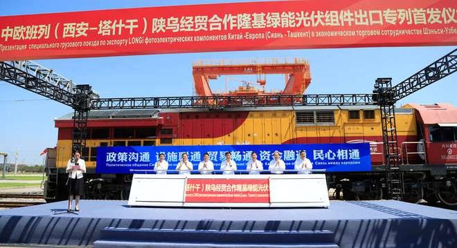 8月3日,中歐班列(西安—塔什干)陜?yōu)踅?jīng)貿(mào)合作隆基綠能光伏組件出口專列首發(fā)儀式在西安國際港務(wù)區(qū)中鐵聯(lián)集西安中心站舉行。