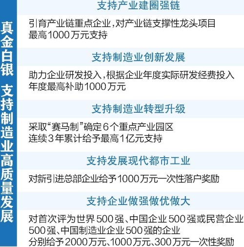 該政策從支持產業(yè)建圈強鏈、支持制造業(yè)創(chuàng)新發(fā)展、支持制造業(yè)轉型升級、支持發(fā)展現代都市工業(yè)、支持企業(yè)做強做優(yōu)做大、加強產業(yè)空間保障、加強資源要素支撐7方面打出一套“組合拳”,最高給予1億元獎勵。