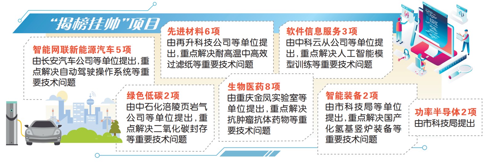 記者了解到,此次“揭榜掛帥”的28個項目中,14個項目被納入重慶市科技重大專項予以支持、安排財政資金1.15億元,其余項目由企業(yè)出資1.06億元支持。單個項目最高支持金額1500萬元。