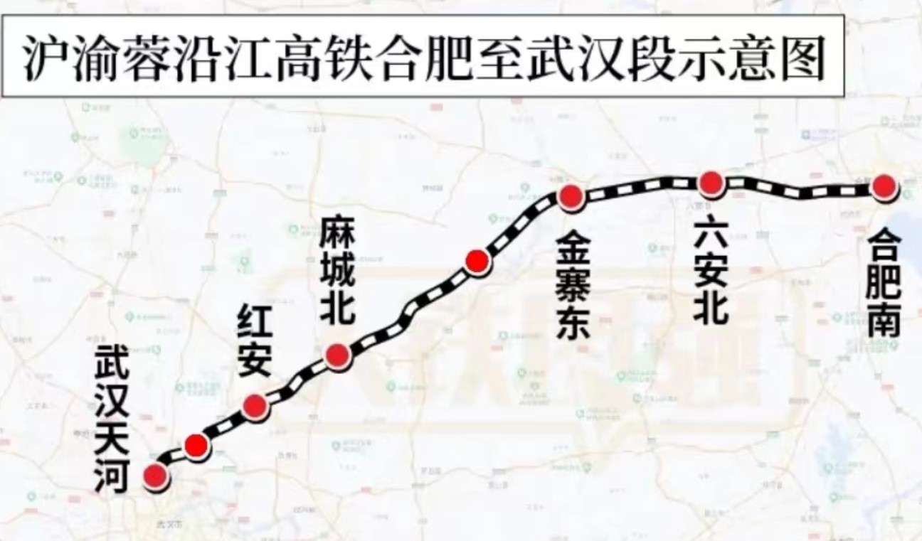 沿江高鐵合武段位于安徽、湖北省境內(nèi),線路起自合肥鐵路樞紐合肥南站,經(jīng)安徽省六安市區(qū)及金寨縣,湖北省麻城市、紅安縣至武漢鐵路樞紐,經(jīng)武漢天河站接入在建的滬渝蓉沿江高鐵武漢至宜昌段。線路全長約360公里,設計時速350公里,共設合肥南等8座車站,建設工期4.5年。