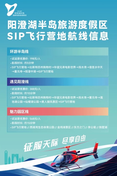 SIP飛行營(yíng)地的落成,將進(jìn)一步豐富度假區(qū)的文旅生態(tài)鏈,以新的業(yè)態(tài)帶動(dòng)度假區(qū)與園區(qū)文旅創(chuàng)新發(fā)展。目前,SIP飛行營(yíng)地已開(kāi)通“環(huán)游半島線”“遇見(jiàn)陽(yáng)澄線”“魅力園區(qū)線”3條路線。其中,“環(huán)游半島線”和“遇見(jiàn)陽(yáng)澄線”可以通過(guò)體驗(yàn)不同線路來(lái)俯瞰半島及陽(yáng)澄湖的萬(wàn)種風(fēng)情;“魅力園區(qū)線”則將陽(yáng)澄湖、金雞湖、獨(dú)墅湖三湖景色盡收眼底,感受非凡園區(qū)的無(wú)窮魅力。