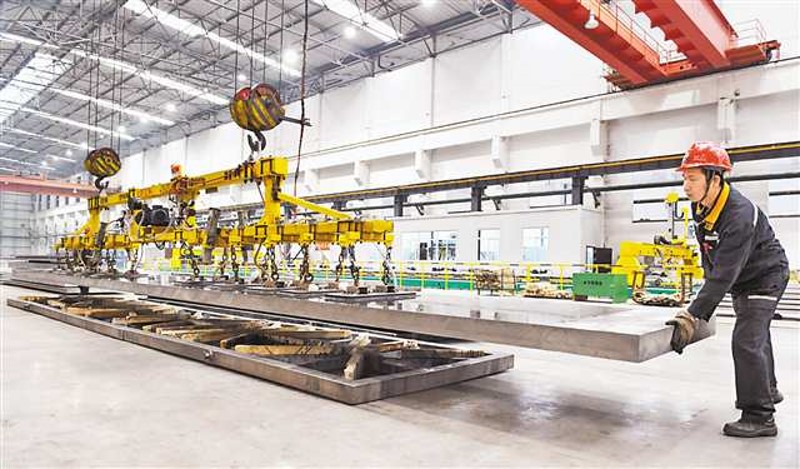 工人正在7050鋁合金預(yù)拉伸厚板生產(chǎn)線上作業(yè)