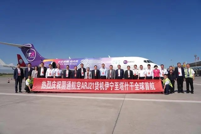 2024年6月6日,由圓通航空ARJ21客改貨飛機(jī)執(zhí)飛的YG9097次航班,滿載貨物從新疆伊寧機(jī)場飛往烏茲別克斯坦塔什干國際機(jī)場,這是ARJ21客改貨飛機(jī)首次商業(yè)飛行,標(biāo)志著ARJ21客改貨飛機(jī)正式投入民航貨運(yùn)市場,ARJ21飛機(jī)系列化發(fā)展邁出新步伐。