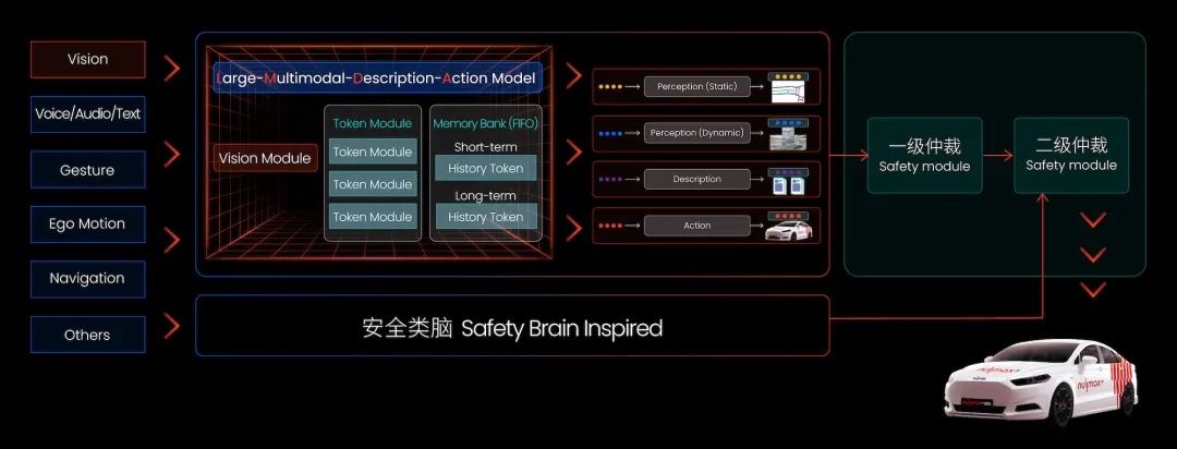 據(jù)Nullmax創(chuàng)始人兼CEO、CTO徐雷博士介紹,在視覺基礎(chǔ)上,NI增加了對聲音、文本、手勢等信息的輸入支持,通過多模態(tài)的端到端模型進(jìn)行任務(wù)的推理,并構(gòu)建了基于類腦神經(jīng)網(wǎng)絡(luò)的安全類腦,由系統(tǒng)整體輸出可視化結(jié)果、場景描述和駕駛行為。