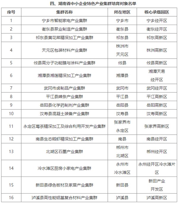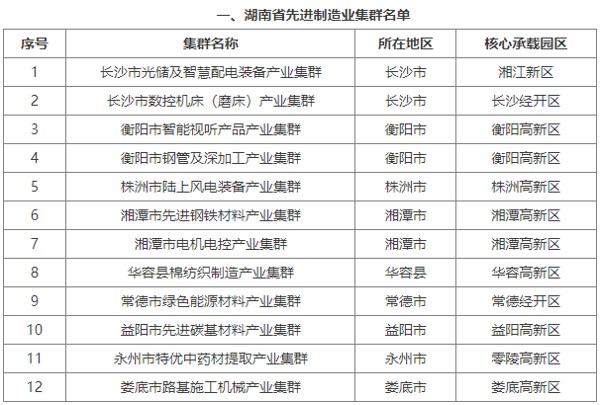 為貫徹落實黨中央、國務(wù)院和省委省政府決策部署,推動我省產(chǎn)業(yè)集群高質(zhì)量發(fā)展,奮力打造國家重要先進(jìn)制造業(yè)高地,根據(jù)《湖南省先進(jìn)制造業(yè)集群培育管理辦法》(湘工信產(chǎn)業(yè)集聚〔2021〕82號)《湖南省產(chǎn)業(yè)集群競賽實施辦法》(湘工信產(chǎn)業(yè)集聚〔2022〕436號)的有關(guān)要求,我廳組織開展了2024年省級產(chǎn)業(yè)集群競賽。經(jīng)集群申報、市州推薦、競賽答辯、專家評審、網(wǎng)上公示等程序,確定長沙市光儲及智慧配電裝備產(chǎn)業(yè)集群等12個集群為省級先進(jìn)制造業(yè)集群,岳麓區(qū)檢驗檢測儀器設(shè)備產(chǎn)業(yè)集群等13個集群為省級中小企業(yè)特色產(chǎn)業(yè)集群,長沙市音視頻裝備產(chǎn)業(yè)集群等8個集群為省級先進(jìn)制造業(yè)集群培育對象,寧鄉(xiāng)市智能家電產(chǎn)業(yè)集群等16個集群為省級中小企業(yè)特色產(chǎn)業(yè)集群培育對象。現(xiàn)將名單予以公布,并將有關(guān)事項通知如下: