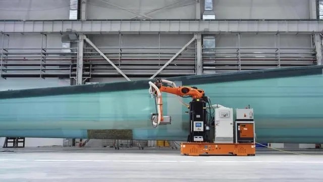 為了提升工廠管理效率和運營精度,三一重能自主研發(fā)數(shù)字元平臺,將數(shù)字孿生技術(shù)、人機互聯(lián)技術(shù)、自動化技術(shù)和5G通信技術(shù)相結(jié)合,可實時監(jiān)控整個葉片生產(chǎn)過程、工藝參數(shù)、技術(shù)指標(biāo)。該工廠利用自動引導(dǎo)運輸車加機器人,配合激光引導(dǎo)和視覺相機引導(dǎo)技術(shù),在末端執(zhí)行工具裝配、打磨、噴涂等作業(yè)時,設(shè)備可實現(xiàn)自動調(diào)整位姿、自動識別葉片外形,并仿形作業(yè),工廠自動化率提升50%,產(chǎn)品質(zhì)量提升30%。
