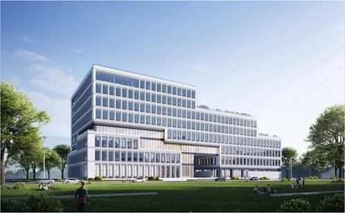 新建廠房秉持現(xiàn)代主義設(shè)計(jì)理念,整體以體塊的堆疊為主,立面主要為灰色仿清水混凝土涂料、深灰色真石漆、藍(lán)灰色玻璃和超白玻璃,充分展現(xiàn)建筑簡(jiǎn)約大方的現(xiàn)代特色。