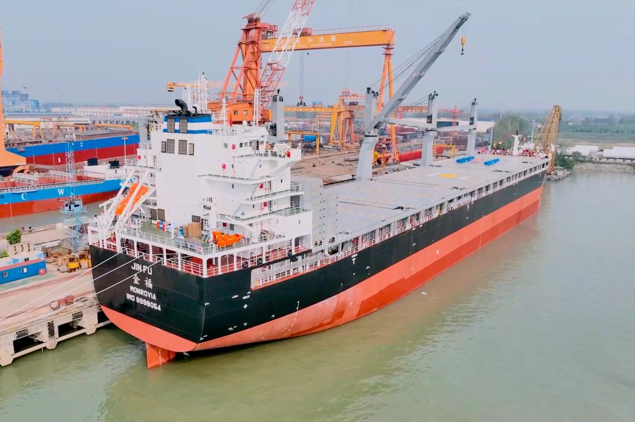 2024年10月10日,中國船舶集團(tuán)有限公司建造的7號(hào)62000噸重吊多用途船“JIN FU”輪命名交付。