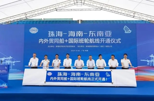 2024年10月30日,“珠?!D稀獤|南亞”內(nèi)外貿(mào)同船及國際班輪航線開通儀式在珠海國際貨柜碼頭(高欄)有限公司舉行。該航線不僅織密了粵港澳大灣區(qū)和海南自由貿(mào)易港的海上通道,還為“珠海制造”走向世界構(gòu)建起降本增效的新路徑,將進(jìn)一步提升珠海在區(qū)域經(jīng)濟(jì)中的樞紐地位。