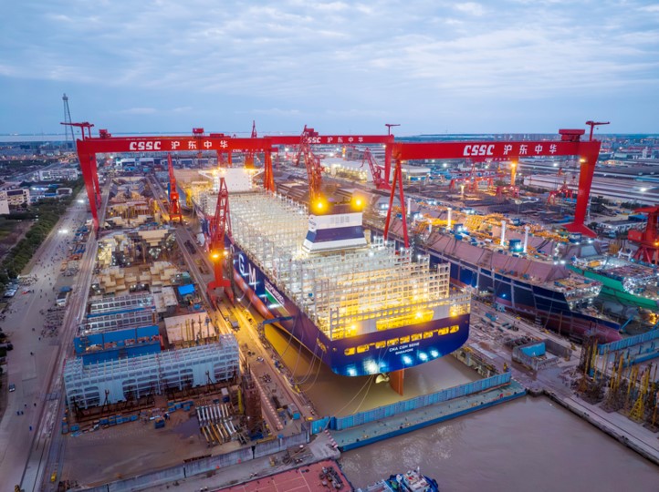 2024年11月20日,由中國船舶集團(tuán)有限公司旗下滬東中華造船(集團(tuán))有限公司自主研發(fā)設(shè)計(jì)建造的全球最大24000TEU級液化天然氣(LNG)雙燃料動力超大型集裝箱船首制船,提前10天在該公司長興島西部廠區(qū)1號船塢順利出塢。