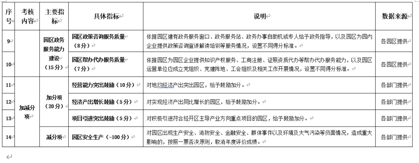 評價(jià)指標(biāo)體系總分為120分,由園區(qū)情況總分100分、加減分20分組成。其中,園區(qū)情況包括四方面10項(xiàng)指標(biāo),分別為園區(qū)經(jīng)營運(yùn)營能力(40分)、園區(qū)配套建設(shè)(15分)、園區(qū)產(chǎn)業(yè)生態(tài)建設(shè)(30分)、園區(qū)政務(wù)服務(wù)能力建設(shè)(15分)。加減分主要是考慮到經(jīng)營能力、項(xiàng)目引進(jìn)突出園區(qū)以及安全生產(chǎn)或生態(tài)環(huán)保等方面出現(xiàn)負(fù)面情況。對經(jīng)營能力、項(xiàng)目引進(jìn)突出園區(qū)給予20分加分,對出現(xiàn)安全生產(chǎn)或生態(tài)環(huán)保等問題,造成重大影響的園區(qū),采取一票否決制,取消園區(qū)評價(jià)資格。