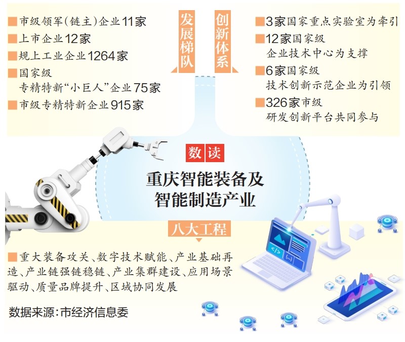 同時(shí),重慶還形成了以3家國家重點(diǎn)實(shí)驗(yàn)室為牽引、12家國家級企業(yè)技術(shù)中心為支撐、6家國家級技術(shù)創(chuàng)新示范企業(yè)為引領(lǐng)、326家市級研發(fā)創(chuàng)新平臺共同參與的智能裝備產(chǎn)業(yè)技術(shù)創(chuàng)新體系,搭建了裝備制造企業(yè)“發(fā)展梯隊(duì)”——全市現(xiàn)有智能裝備領(lǐng)域市級領(lǐng)軍(鏈主)企業(yè)11家,上市企業(yè)12家,規(guī)上工業(yè)企業(yè)1264家,國家級專精特新“小巨人”企業(yè)75家、市級專精特新企業(yè)915家。