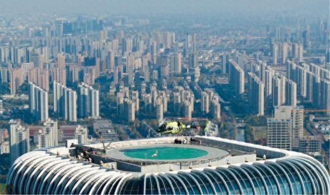 2024年12月15日,一架綠色Bell505直升機自紹興大禹陵祭禹廣場起飛,降落至杭州濱江世茂智慧之門之門樓頂。