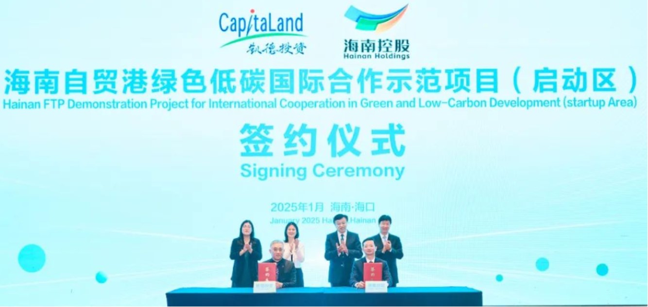2025年1月22日,海南省發(fā)展控股有限公司與凱德投資旗下凱德(中國(guó))企業(yè)管理有限公司在海口舉行簽約儀式,海南自貿(mào)港綠色低碳國(guó)際合作示范項(xiàng)目(啟動(dòng)區(qū))也同步正式開工建設(shè),為自貿(mào)港政策應(yīng)用打造示范場(chǎng)景,助力海南自貿(mào)港“兩個(gè)基地”“兩個(gè)樞紐”“兩個(gè)網(wǎng)絡(luò)”建設(shè)。海南省委書記馮飛、省長(zhǎng)劉小明見(jiàn)證簽約,并在簽約前會(huì)見(jiàn)凱德投資首席企業(yè)官柯麗芬。