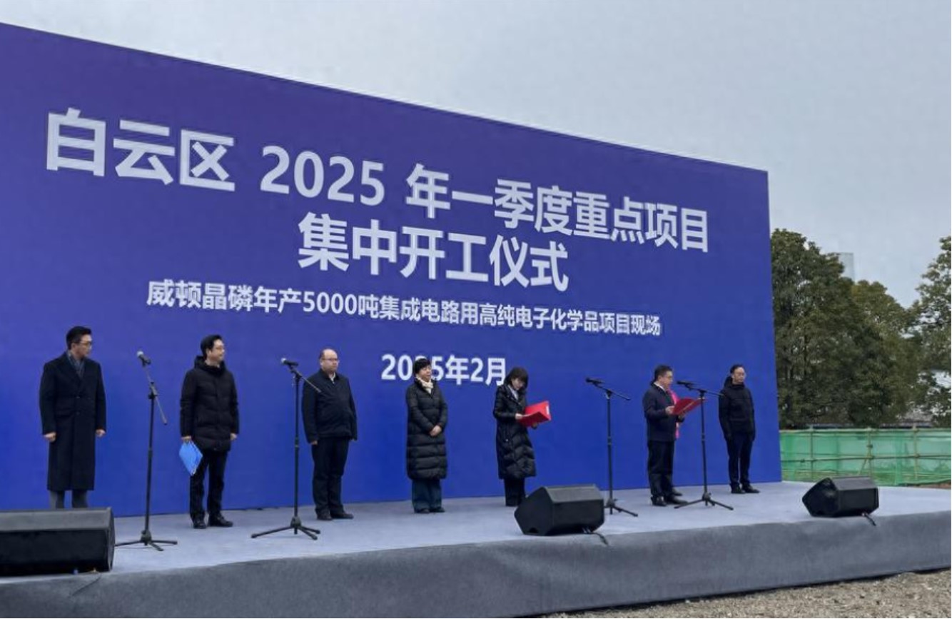 2025年2月24日,白云區(qū)2025年一季度重點(diǎn)項(xiàng)目集中開(kāi)工儀式在白云區(qū)威頓晶磷年產(chǎn)5000噸集成電路用高純電子化學(xué)品項(xiàng)目現(xiàn)場(chǎng)舉行。此次集中開(kāi)工項(xiàng)目共20個(gè),總投資達(dá)51.24億元,為該區(qū)大抓產(chǎn)業(yè)、大抓項(xiàng)目、大抓招商推動(dòng)“強(qiáng)省會(huì)”奠定堅(jiān)實(shí)基礎(chǔ)。