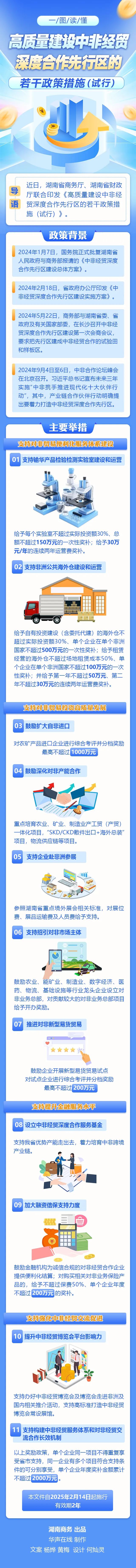 2025年2月14日,湖南省商務廳、湖南省財政廳聯(lián)合印發(fā)《高質(zhì)量建設中非經(jīng)貿(mào)深度合作先行區(qū)的若干政策措施(試行)》(以下簡稱《政策》),助力湖南省依托先行區(qū)培育和引進對非經(jīng)貿(mào)合作資源,努力構(gòu)建中非經(jīng)貿(mào)合作服務體系,打造地方對非經(jīng)貿(mào)合作“國家隊”。