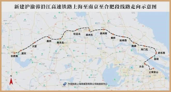 北沿江高速鐵路,即上海至南京至合肥高速鐵路(滬渝蓉高速鐵路上海至合肥段),起自上海市上海寶山站,經(jīng)江蘇省蘇州市、南通市、泰州市、揚州市、南京市及安徽省滁州市、合肥市,接入合肥南站,正線長度553.762公里,設計速度350公里/小時,全線設16座車站。