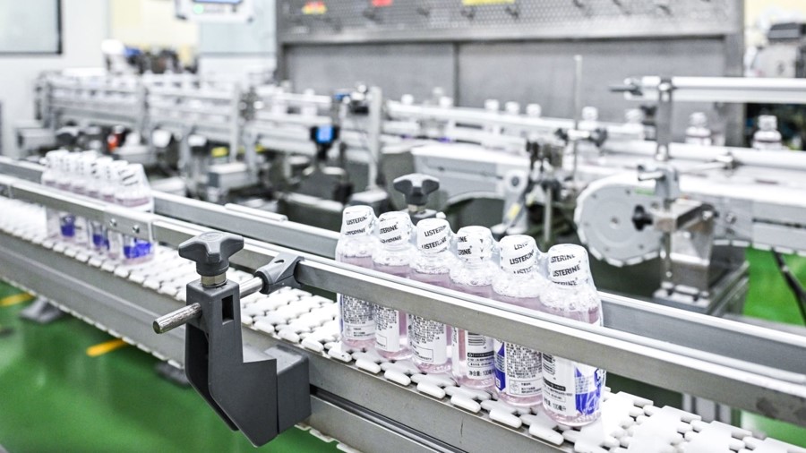 “我們的優(yōu)勢(shì)在于,研發(fā)中心與生產(chǎn)工廠處在同一個(gè)園區(qū)內(nèi),為新品的研發(fā)提供了極大的便利。我們的研發(fā)同事可以和供應(yīng)鏈同事‘手拉手’,在研發(fā)過(guò)程中,就把工廠的設(shè)備與需求設(shè)計(jì)到產(chǎn)品中,工廠的同事也能夠更早介入,為研發(fā)提供建議和意見(jiàn),使得整個(gè)過(guò)程更加高效流暢。”走出研發(fā)中心,經(jīng)過(guò)一個(gè)路口后,就來(lái)到了李施德林漱口水的生產(chǎn)車(chē)間。這里能夠生產(chǎn)20種配方、5種瓶型,總計(jì)100多款(SKU)漱口水,并且效率極高,生產(chǎn)線(xiàn)平均每分鐘能夠生產(chǎn)近200瓶漱口水。