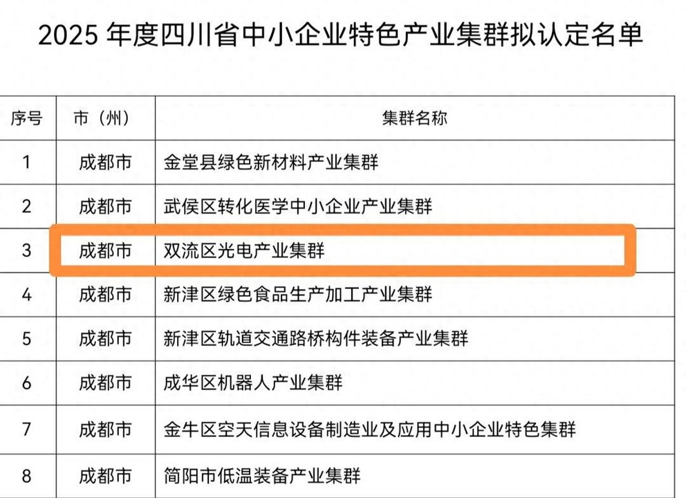 日前,2025年度四川省中小企業(yè)特色產(chǎn)業(yè)集群擬認(rèn)定名單出爐,其中成都雙流區(qū)光電產(chǎn)業(yè)集群入選。據(jù)悉,這是雙流首個(gè)省級(jí)中小企業(yè)特色產(chǎn)業(yè)集群,從中國(guó)科學(xué)院種子到省級(jí)產(chǎn)業(yè)集群,雙流用30年織就一張“追光網(wǎng)”:120+企業(yè)、18個(gè)科研平臺(tái)、300+年專利構(gòu)筑西部光電高地。