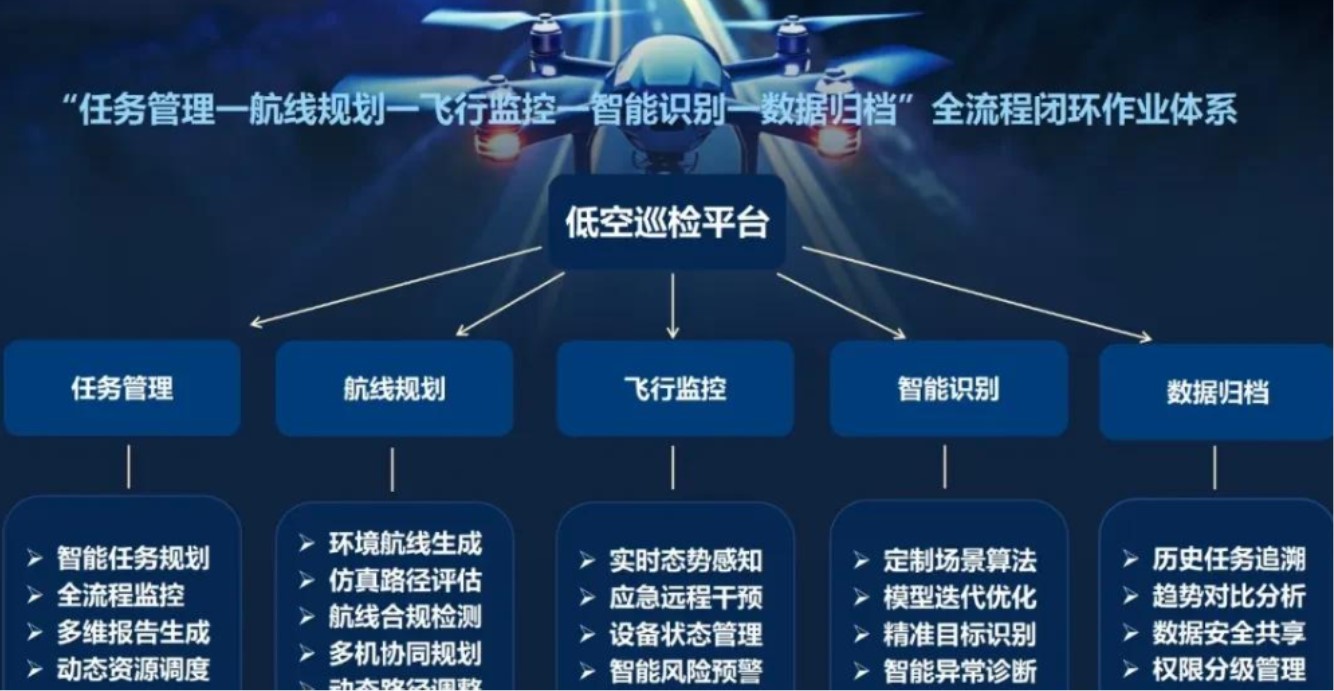 低空AI綜合巡檢平臺著力于解決現(xiàn)有無人機(jī)巡檢作業(yè)存在的效率瓶頸、數(shù)據(jù)孤島、響應(yīng)滯后、操作門檻等痛點,創(chuàng)新性地構(gòu)建了“任務(wù)管理—航線規(guī)劃—飛行監(jiān)控—智能識別—數(shù)據(jù)歸檔”全流程智能閉環(huán)系統(tǒng),依托預(yù)訓(xùn)練模型的AI識別能力、飛行全流程智能決策與可視化作業(yè)管理技術(shù)等核心技術(shù),全面滿足復(fù)雜場景下的無人化巡檢作業(yè)需求。