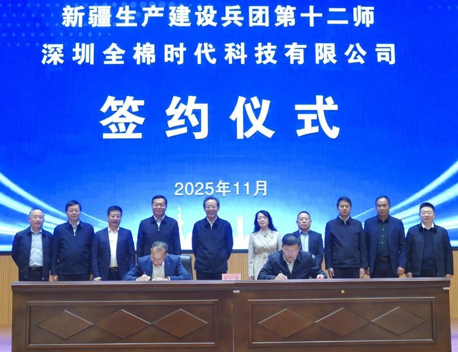 2025年11月12日,十二師與深圳全棉時代科技有限公司簽訂投資合作協(xié)議,計劃投資約20億元打造全棉水刺無紡布系列產(chǎn)品生產(chǎn)銷售基地。