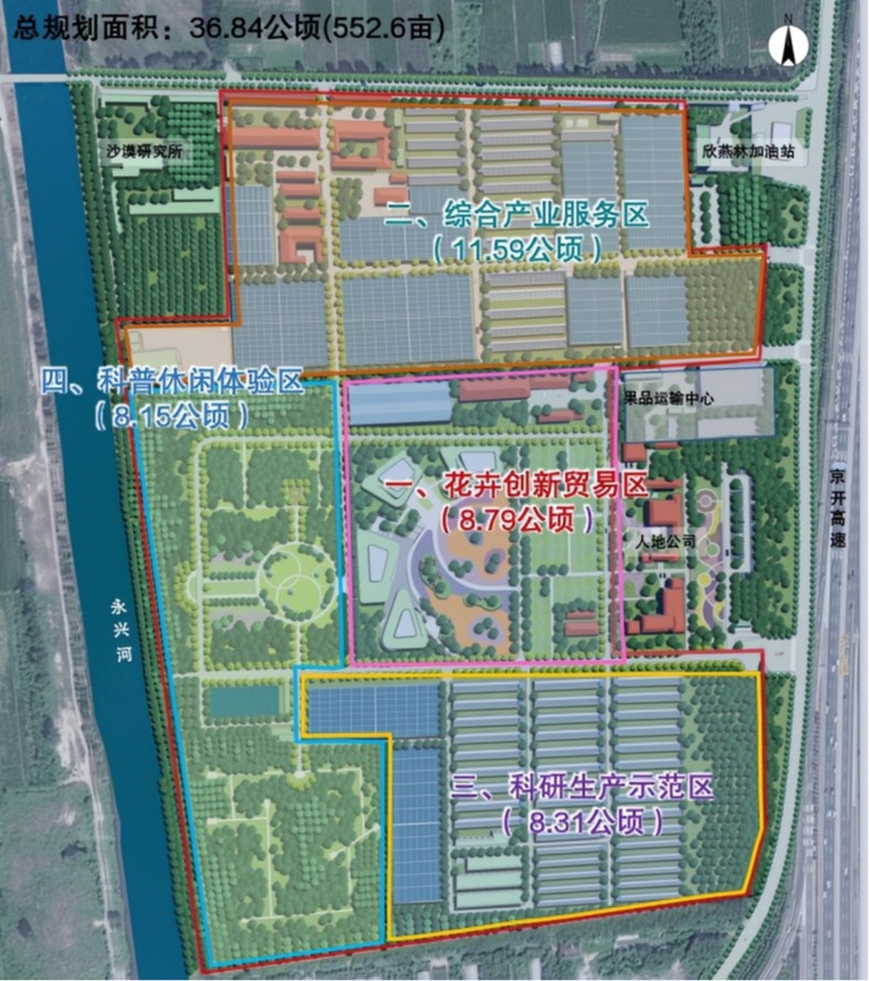 園區(qū)規(guī)劃建設(shè)四大功能分區(qū),形成“前研后銷、中段提質(zhì)”的完整產(chǎn)業(yè)鏈閉環(huán),全面推動(dòng)花卉產(chǎn)業(yè)從種植生產(chǎn)到交易流通、從科研創(chuàng)新到體驗(yàn)消費(fèi)的全鏈條升級(jí):花卉創(chuàng)新貿(mào)易區(qū)以前沿科研和國(guó)際商貿(mào)為核心,重點(diǎn)建設(shè)國(guó)際花卉種業(yè)科研中心與低溫冷庫(kù)處理中心,打造總部經(jīng)濟(jì)與會(huì)展平臺(tái),吸引全球花卉企業(yè)集聚;綜合產(chǎn)業(yè)服務(wù)區(qū)提供智能溫室、日光大棚等現(xiàn)代化生產(chǎn)空間,配備專業(yè)科研支持與供應(yīng)鏈服務(wù),助力企業(yè)實(shí)現(xiàn)從研發(fā)到市場(chǎng)的全流程發(fā)展;科研生產(chǎn)示范區(qū)聚焦種質(zhì)創(chuàng)新與低碳栽培等關(guān)鍵技術(shù),推動(dòng)科技成果轉(zhuǎn)化與示范應(yīng)用,系統(tǒng)提升生產(chǎn)效率和產(chǎn)品品質(zhì);科普休閑體驗(yàn)區(qū)融合自然教育、花田觀光與親子度假等多元業(yè)態(tài),打造沉浸式花園場(chǎng)景,持續(xù)拓展“花卉+文旅”消費(fèi)體驗(yàn)。通過四大功能區(qū)協(xié)同發(fā)展,園區(qū)將實(shí)現(xiàn)從花卉研發(fā)、生產(chǎn)到交易、服務(wù)的全生態(tài)布局,助力北京花卉產(chǎn)業(yè)提質(zhì)增效。