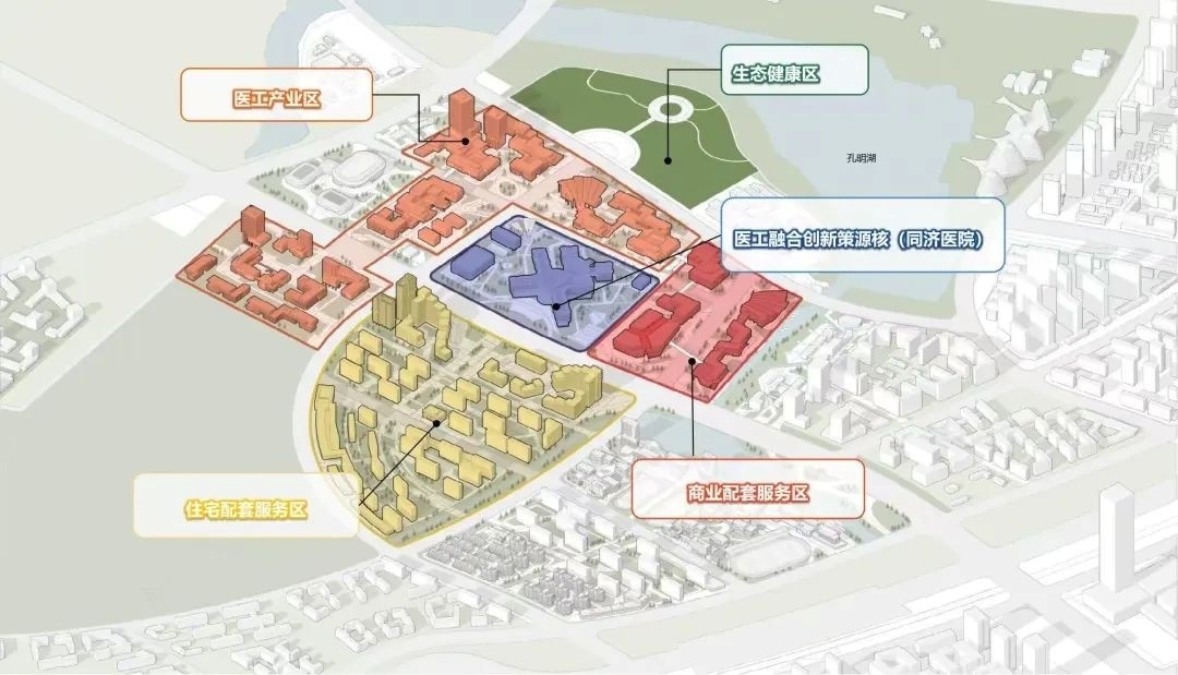 武漢軍山同濟醫(yī)工產業(yè)園以同濟軍山醫(yī)院為核心,規(guī)劃1平方公里核心圈層,布局約500畝產業(yè)用地,分四期開發(fā),聚焦“材、動、裝、智”新賽道,重點發(fā)展醫(yī)工新材料、康復器械、醫(yī)療設備及AI醫(yī)療等產業(yè)領域,本次開工的項目一期包含三中心創(chuàng)新平臺、學術交流展示中心、專利信息中心、醫(yī)療研發(fā)中心,預計2027年7月完工。