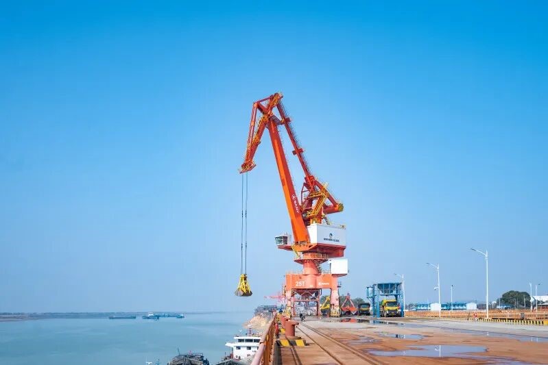 陽(yáng)光正好,江風(fēng)獵獵,還未進(jìn)港,機(jī)械的轟鳴聲便已隨風(fēng)入耳。碼頭上,高聳入云的45噸、25噸門(mén)座式起重機(jī)巍然矗立,鋼鐵巨臂在空中緩緩轉(zhuǎn)動(dòng),抓斗起落間,一船船砂石被穩(wěn)穩(wěn)卸下。發(fā)動(dòng)機(jī)低沉咆哮,輪胎碾過(guò)地面沙沙作響,指揮哨音與對(duì)講機(jī)指令此起彼伏。散貨運(yùn)輸車(chē)交替穿梭,橙色車(chē)影在泊位與堆場(chǎng)之間織成一道流動(dòng)的風(fēng)景。