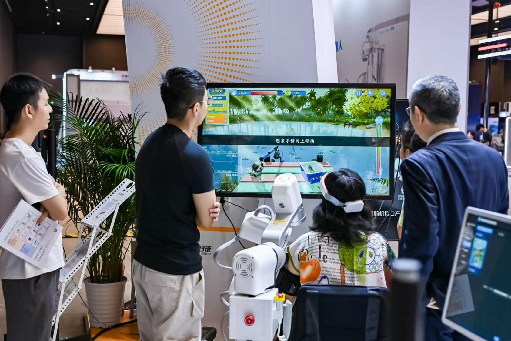 與傳統(tǒng)康復機器人僅替代治療師的體力勞動不同,腦機接口康復機器人的革命性在于讓患者主動參與。系統(tǒng)通過非侵入式頭環(huán)“讀懂”患者的運動意圖,再驅(qū)動機器人輔助完成動作?;谏窠?jīng)可塑性原理,這種“心念一動,機器即行”的主動訓練模式,能大幅提升康復效率。謝龍漢教授介紹,目前系統(tǒng)對運動意圖的解碼準確率已超過90%,并設計了多傳感器容錯機制,全力保障患者安全。